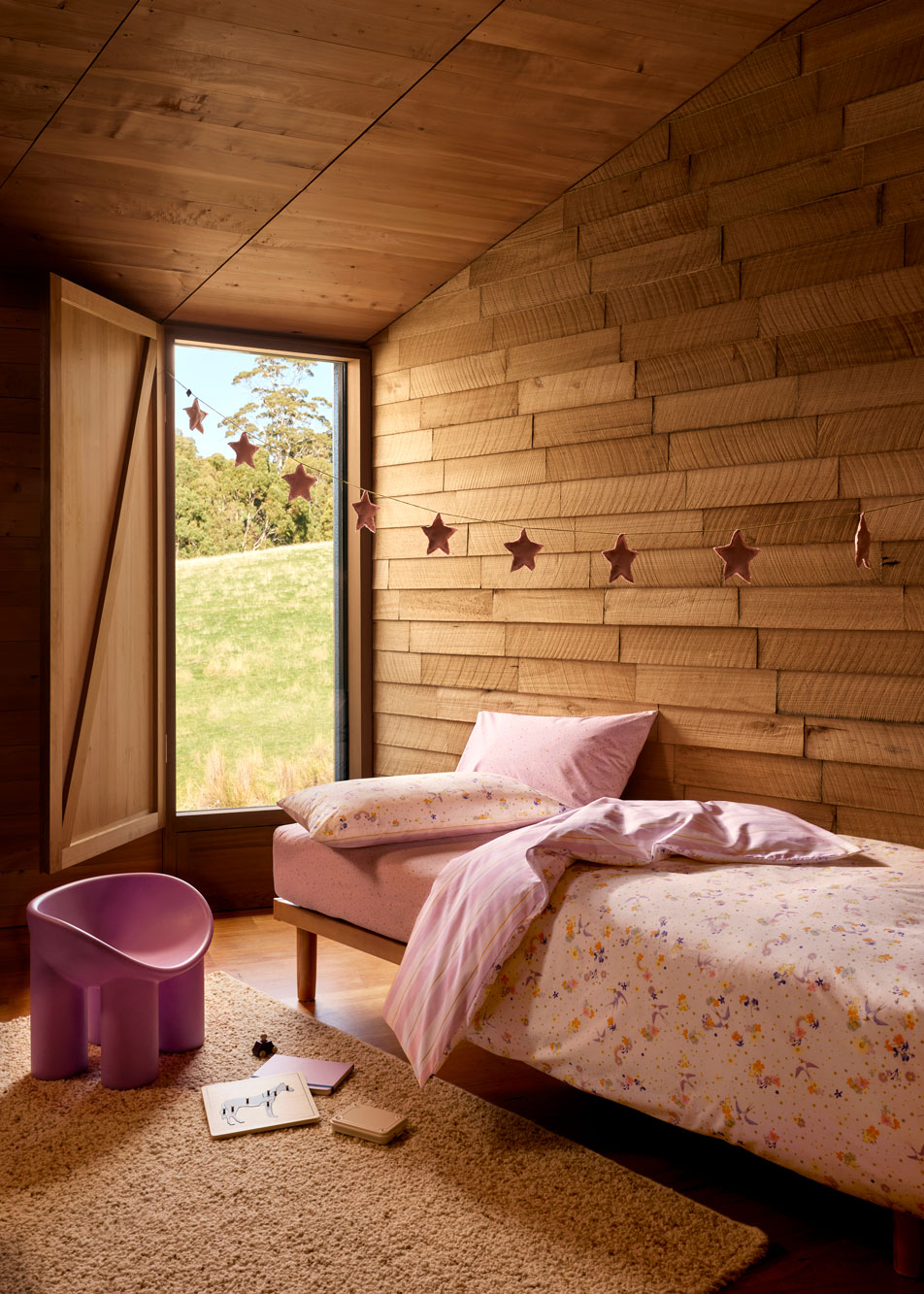 Nostalgia-fuelled prints are key to this trend. Classic motifs like vintage rocket ships, shooting stars (not unlike the glow-in-the-dark ones we all stuck to our ceilings back in the day) and butterflies are all at home in this playful aesthetic. Not only are these touches whimsical enough to engage young ones, but they’re filled with warm and fuzzy nostalgic feels for parents to enjoy too.
