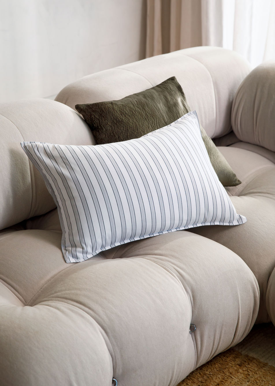 Having a few different-sized cushions on the couch or bed will help to create a more inviting look. Make your space welcoming with a mix of square and breakfast cushions.