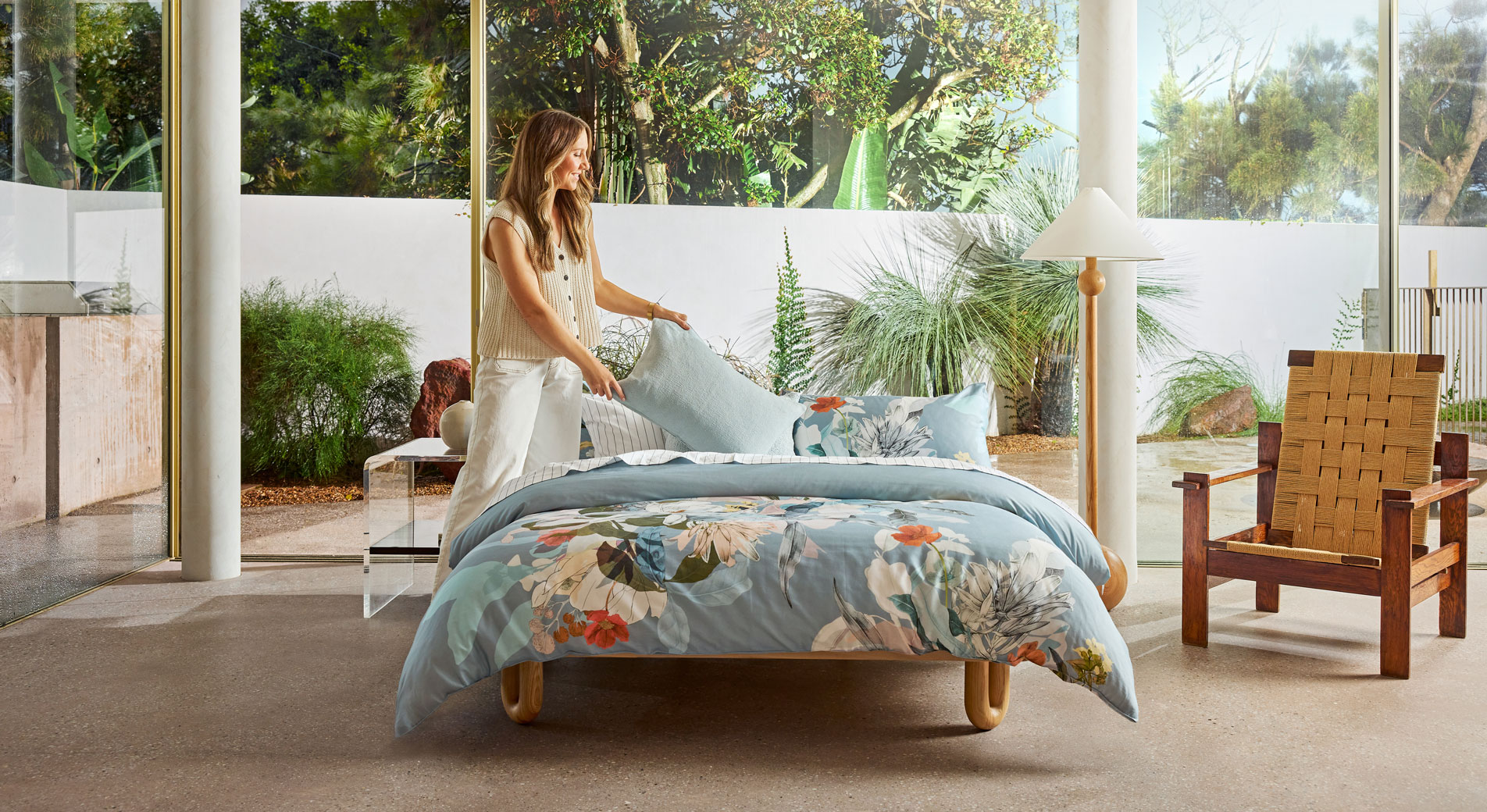 For this Styling Series instalment, Fiona’s source of inspiration is our Brielle Quilt Cover. Brielle features a statement floral print with plenty of colour pops throughout — making it an ideal playground for experimenting with colour. These same tips will apply if you have another statement piece in your bedroom, like a bold rug or an artwork. When you add cushion colours into the mix, you'll immediately notice it starts to pull out the colours from the print. So, let’s begin.