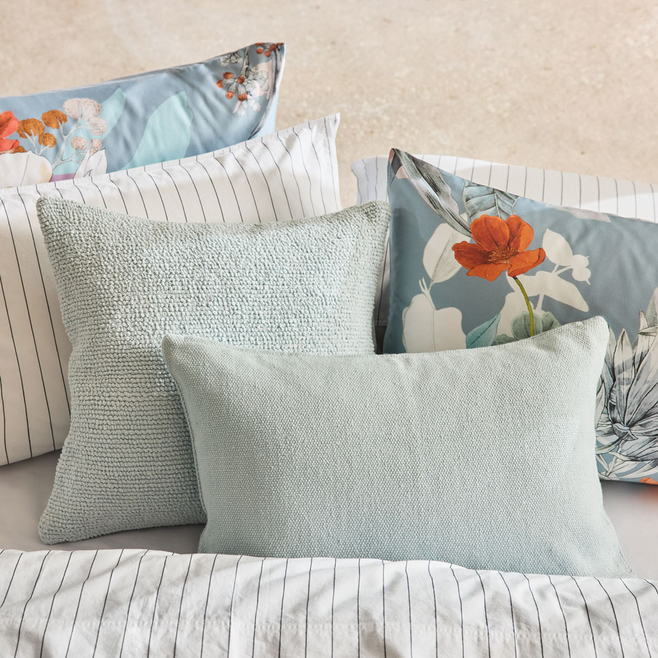 If you're a fan of subtlety and gentle layering, styling with tonal shades is for you. For this look, we’re focusing on colours that complement the light blue base of our quilt cover.