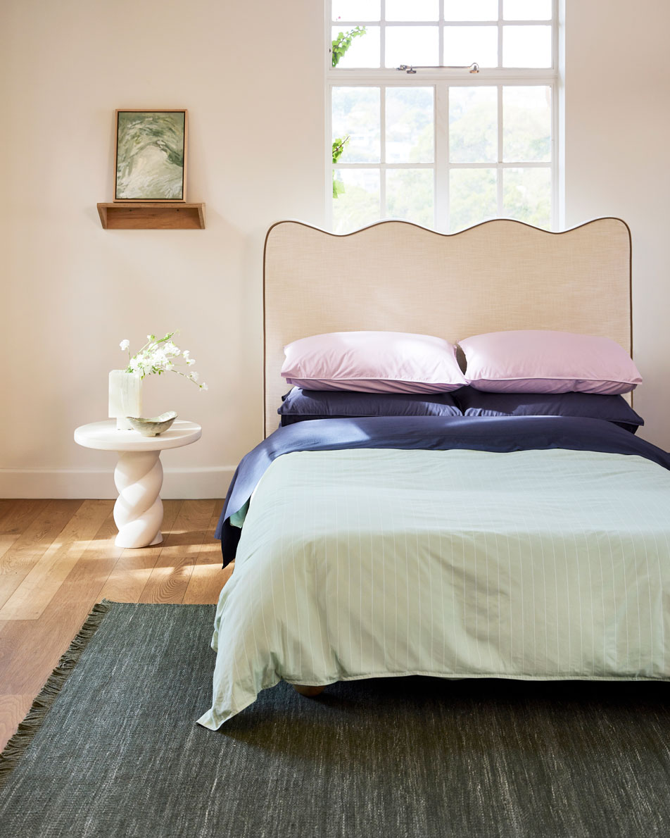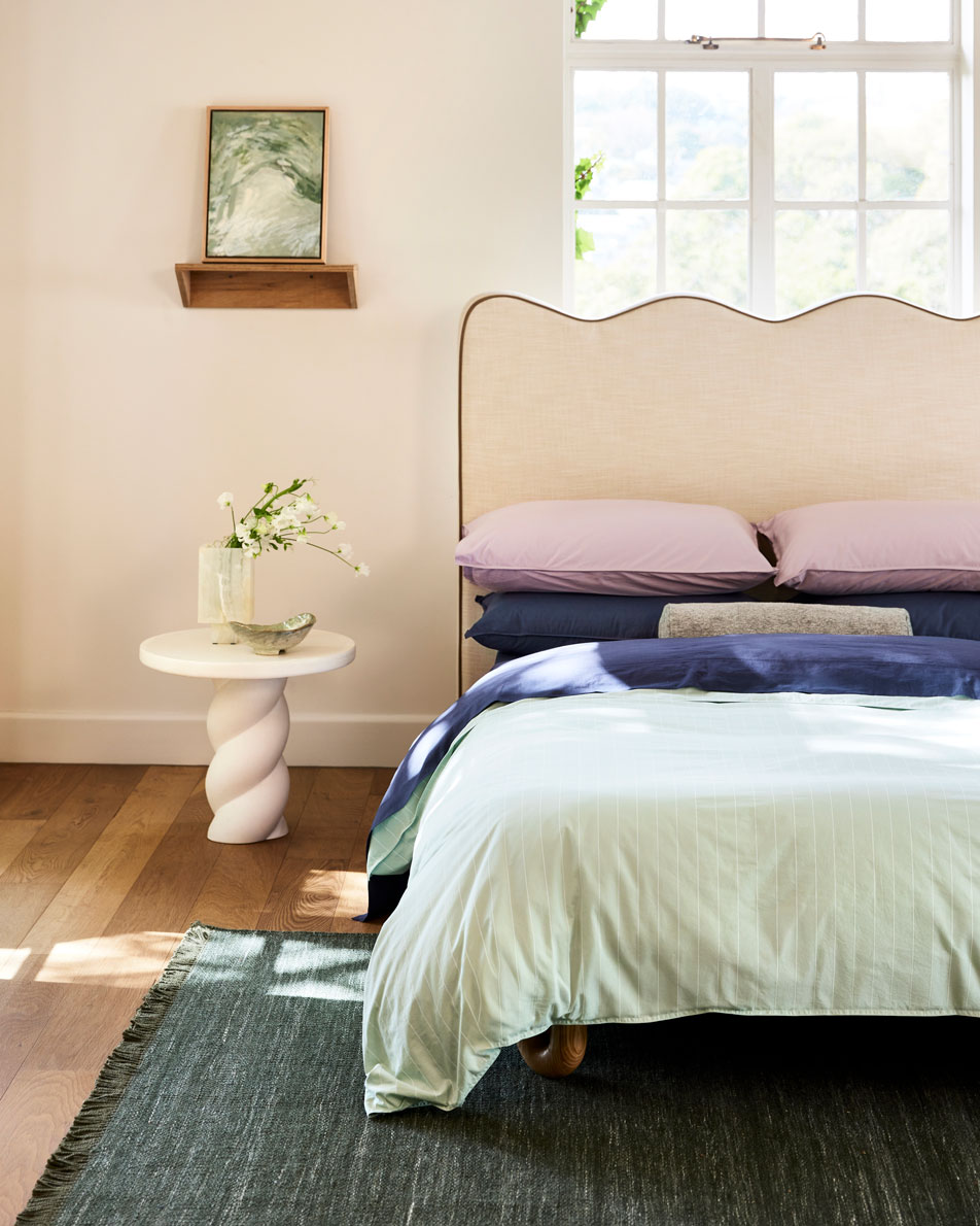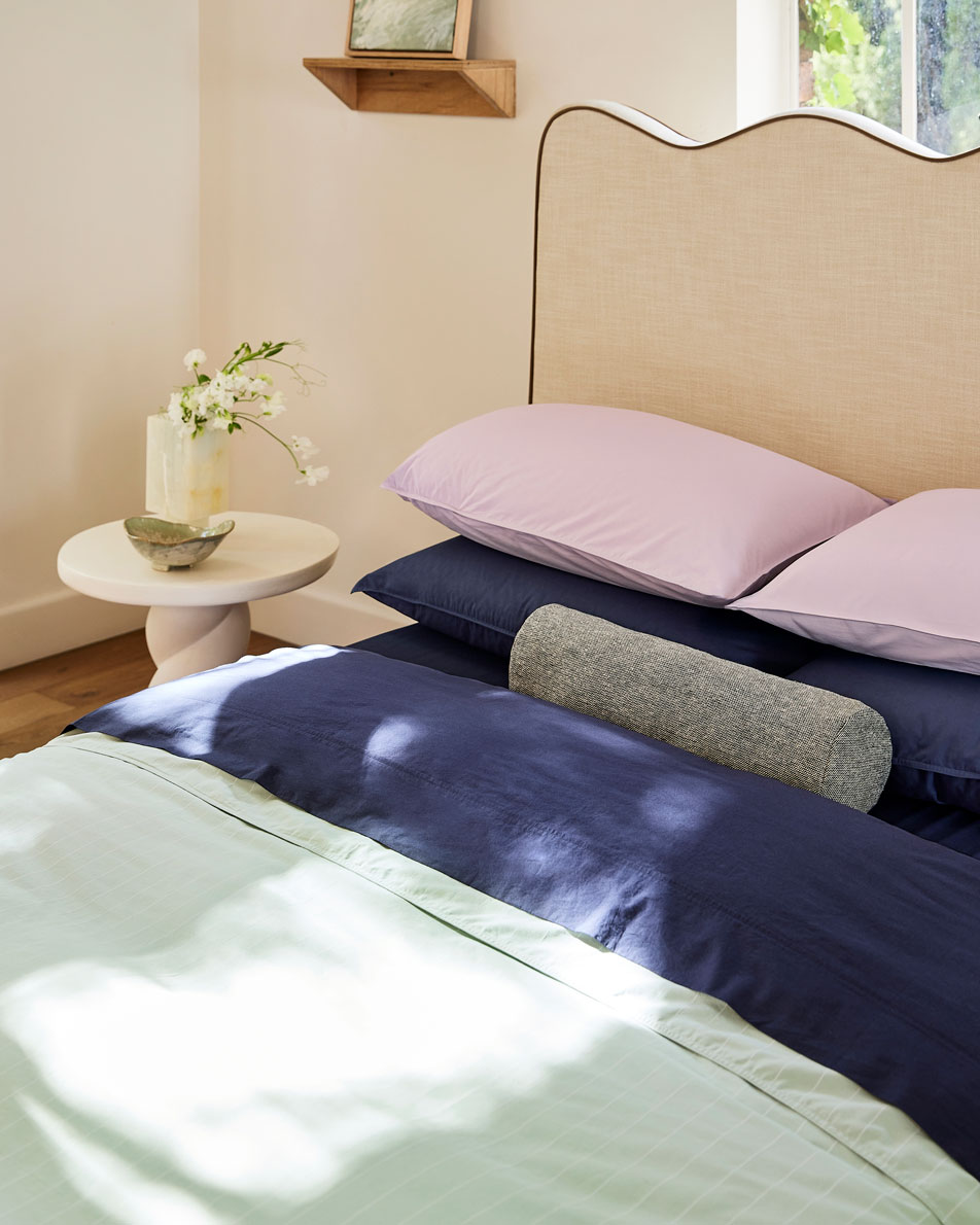 Pillowcases are a simple way to introduce an accent colour. The Bayley Washed Percale pillowcases in dusty mauve bring softness and a hint of playfulness. The delicate mauve melds seamlessly with the deep sea and cool mint, creating an unexpected yet harmonious palette.